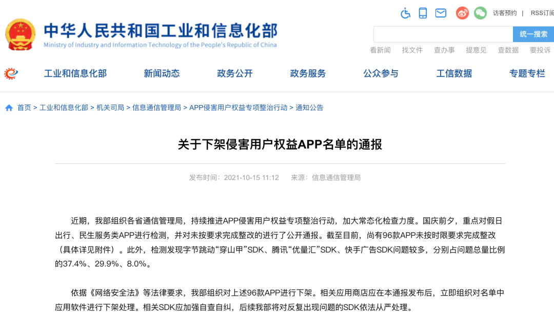 2021年10月15日,工信部发布了《关于下架侵害用户权益App名单的通报》,通报中一共下架了96款App。值得关注的是,在本次通报中首次通报了SDK存在较多问题,并明确后续会将反复出现问题的SDK从严处理。