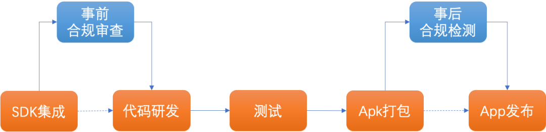 App在嵌入第三方SDK并且初始化以后,SDK在个人信息收集行为方面就不受App的控制了,SDK可以采用异步或者其它的技术手段在后台运行代码。如果是恶意SDK的话,很可能出现在后台隐蔽执行恶意行为,App无法察觉。目前大部分App开发商对SDK合规性检测的做法是,完成App的整体研发以后,将Apk包进行自行检测或者交由第三方进行检测,检测出现问题后进行问题的定位,是否问题是SDK的行为。这种方式属于事后检测的方法,能够发现嵌入SDK的不合规行为,但是会有两个问题: