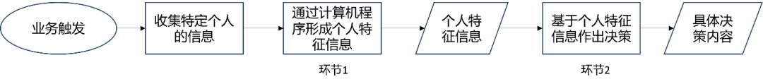 《个人信息保护法》指出,自动化决策是指通过计算机程序自动分析、评估个人的行为习惯、兴趣爱好或者经济、健康、信用状况等,并进行决策的活动。《要求》将自动化决策进一步分解为特征生成和决策两个环节。特征生成是通过计算机程序自动处理个人信息,经过个人特征提取、特征选择、特征计算、特征输出等步骤,生成开展针对个人决策所需的输入信息的过程。决策是以生成的个人特征信息为输入,作出针对个人将采取具体行动的决定。自动化决策流程图如下: