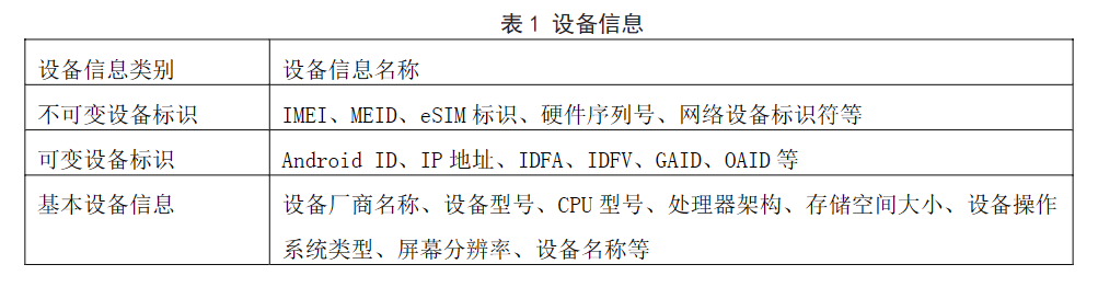 目前行业内往往都会收集唯一设备识别码,其可分为不可变和可变更两类,《App收集使用个人信息最小必要评估规范 设备信息》对此具体列举如下。不可变的唯一设备识别码往往会受到更严格的限制,《要求》附录E中的15类SDK均只将可变更的唯一设备识别码视为最小必要的个人信息。