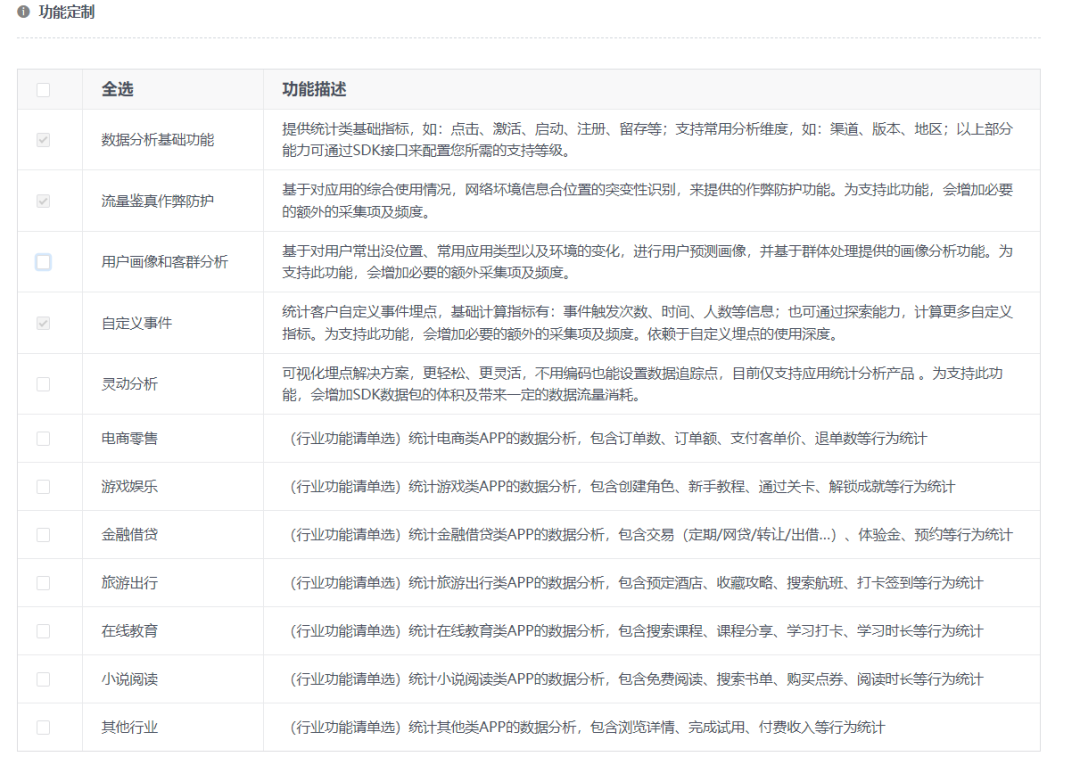 为了满足App运营者的自主选择权及最小必要原则,针对SDK独立的功能模块,TalkingData会提供单独的开启和关闭选项。TalkingData要求App运营者在下载SDK前,应当自主勾选所需要的具体功能模块,不会强制捆绑无关功能,亦不会以此为由申请无关权限或收集无关的个人信息。TalkingData SDK下载页面的截图如下:
