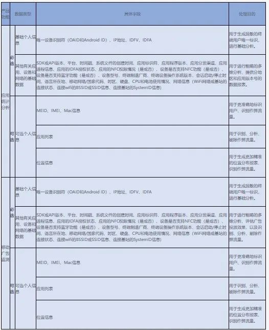 除此之外,GB/T 35273—2020进一步要求披露收集、使用个人信息的业务功能,以及各业务功能分别收集的个人信息类型,附录C也指出产品或服务需区分基本业务功能和扩展业务功能,所以SDK运营者均需要通过隐私政策来告知具体的个人信息收集使用规则,随着监管要求不断细化,SDK运营者的告知义务需细化至具体的个人信息字段以及是否属于必选或可选收集的个人信息类型。