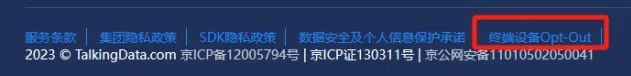 TalkingData官网的TalkingData SDK隐私政策和TalkingData集团隐私政策已经披露了终端用户的个人信息权利保障机制,为方便终端用户行使拒绝权,TalkingData还特别在官网底部设置了OPT-OUT链接,帮助终端用户便捷地行使拒绝权。OPT-OUT链接的截图如下: